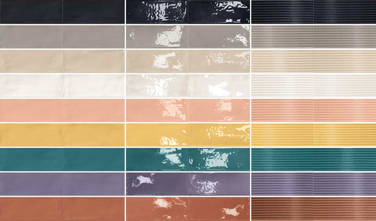 They are the result of a significant expansion of the digital decoration system, with a total of ten print bars, making it possible to obtain trendy shades that are in high demand among architects and interior designers, but are scarcely or not at all available on the ceramic market.The design integrates influences from traditional majolica, whose craftsmanship underlies the gently undulating and softly imperfect surface. Alongside the natural finish, which is matt, but soft to the touch, the gloss finish further emphasizes this link with the most typical ceramics of the Mediterranean tradition. The two surface finishes, which are available in all colors, are complemented by the Plissé decor with its distinctly three-dimensional structure.